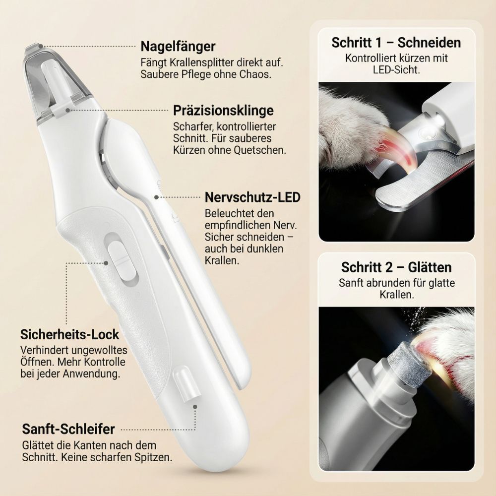 Die zwei integrierten LED's leuchten die Kralle von innen aus und machen den empfindlichen Nerv sichtbar, selbst bei dunklen Krallen. So siehst du genau, wo du sicher schneiden kannst.