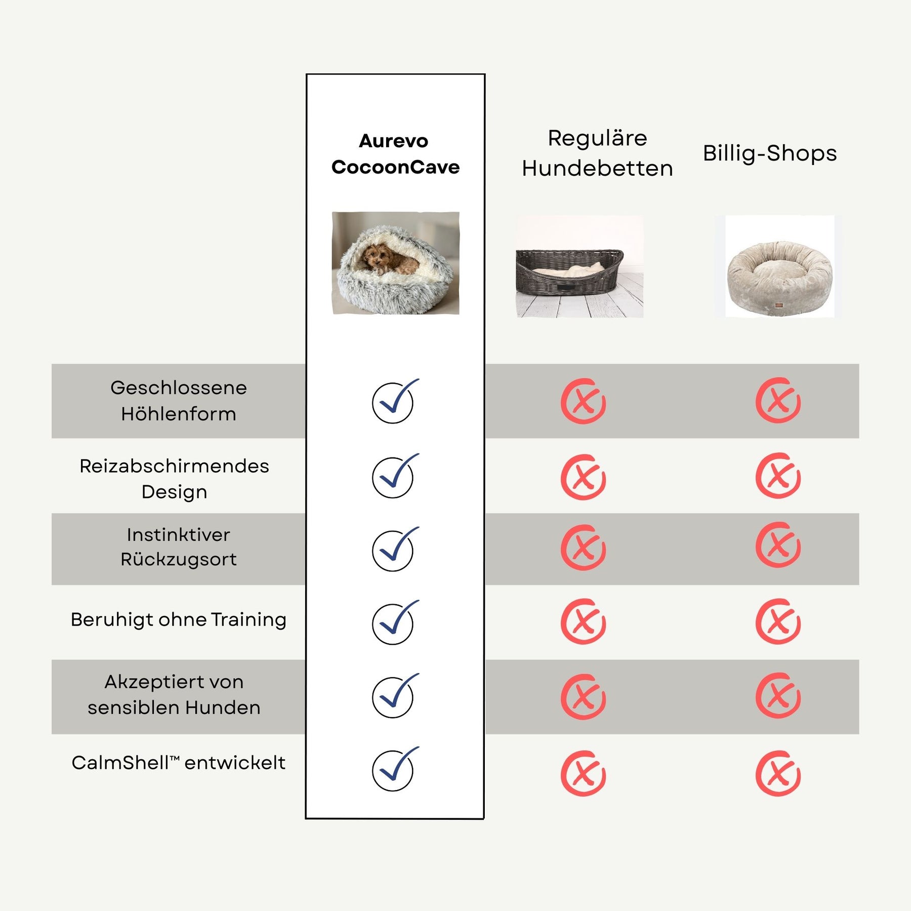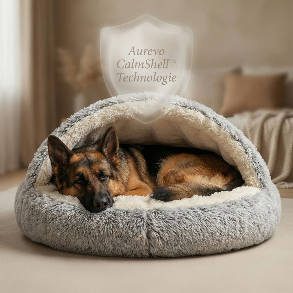 Das CalmShell™-Prinzip kombiniert erhöhte Umrandung, weiche Kapuze und runde Form. Äussere Reize wie Licht und Bewegung werden reduziert, während sanfter Körperkontakt Geborgenheit schafft. Dein Hund muss nicht mehr wachsam bleiben.